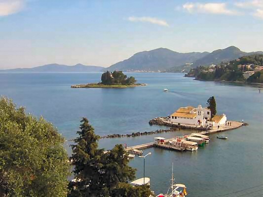 The sweep of Garitsa Bay leads you round to the village of Anemomylos and to the Kanoni peninsular. The eastern port of ancient Corcyra, the harbour of Alkinoos, was situated towards the southern end of the bay, but few remains can be seen today.